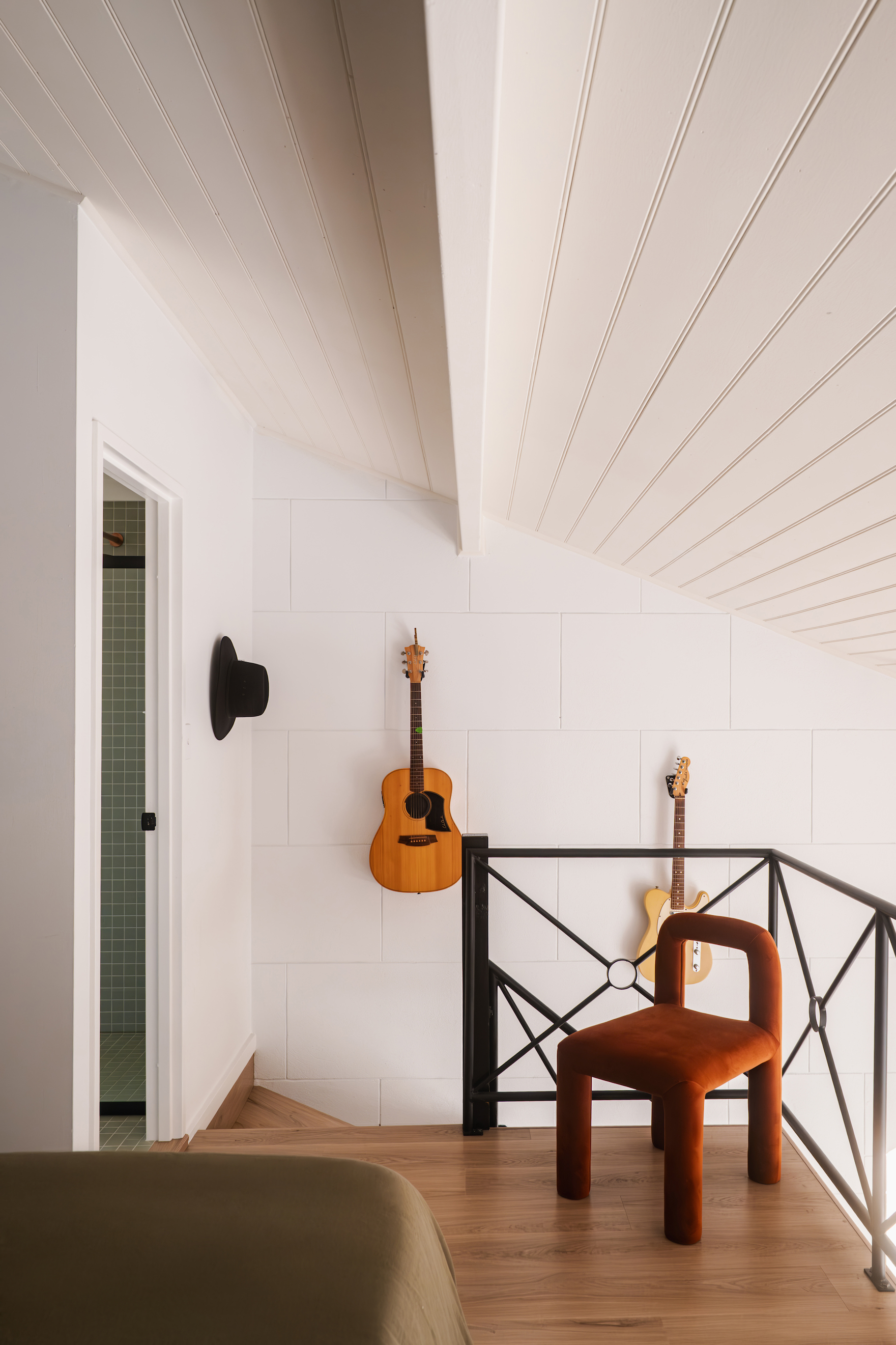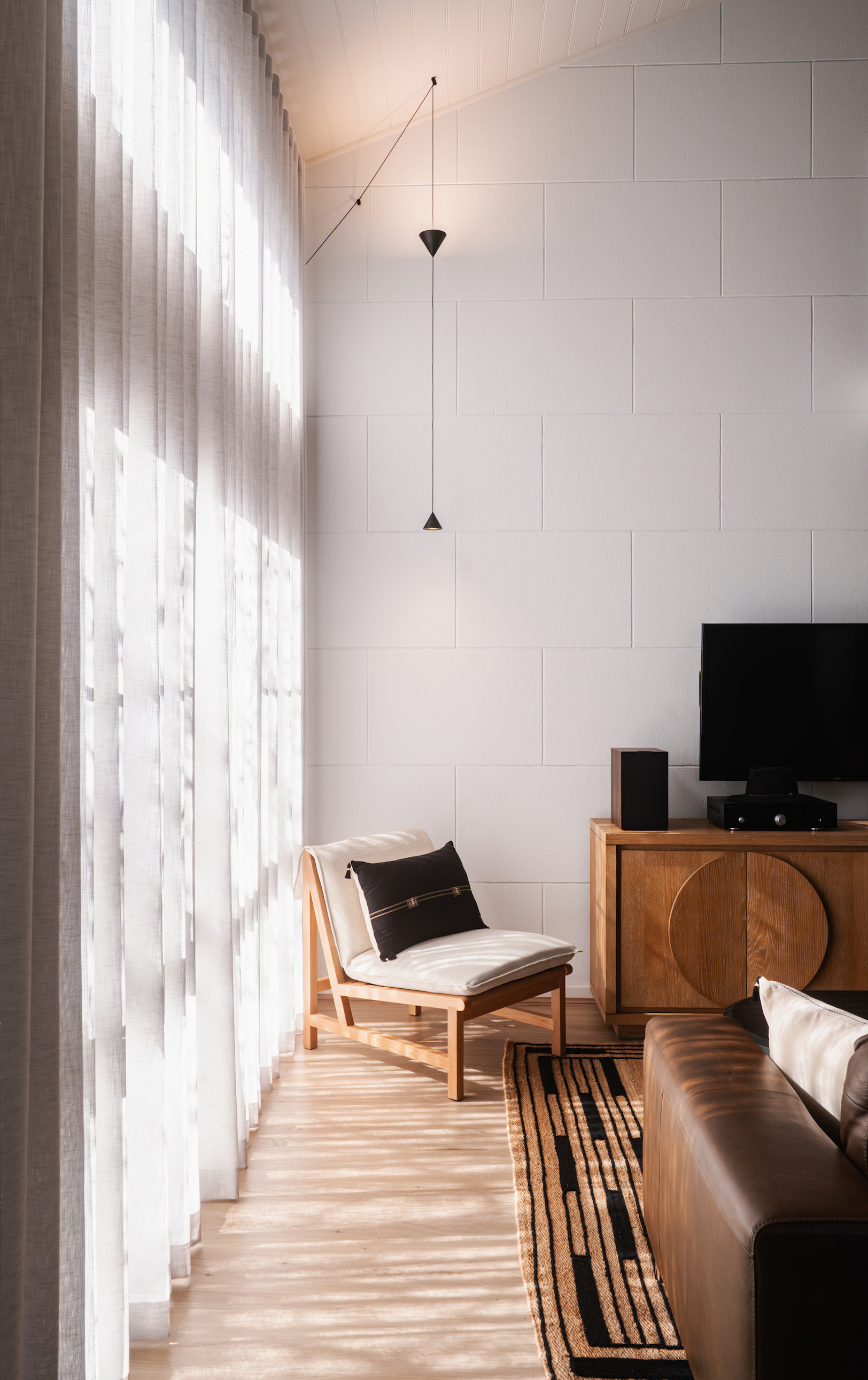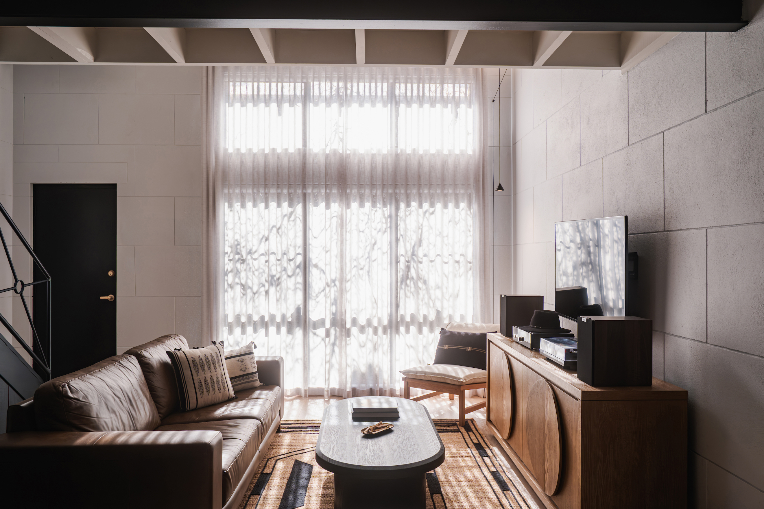 Our Hudson Project reimagines an inner-city loft into asleek, low-maintenance retreat tailored for both relaxation and entertaining. The design juxtaposes industrial elements, such as exposed steel timber beams, with a polished interior, blending timber flooring and a moody palette. The cleverly optimized kitchen and thoughtful furniture arrangement ensure that space limitations do not hinder functionality or style. Natural fibres, leather accents, and earthy tones enrich the ambiance, while bold art selections injects striking personality. The loft's white-washed walls are thoughtfully balanced with darker elements, including furniture and dark-stained kitchen cabinets, creating a harmonious, understated environment that captures the essence of contemporary sophistication.